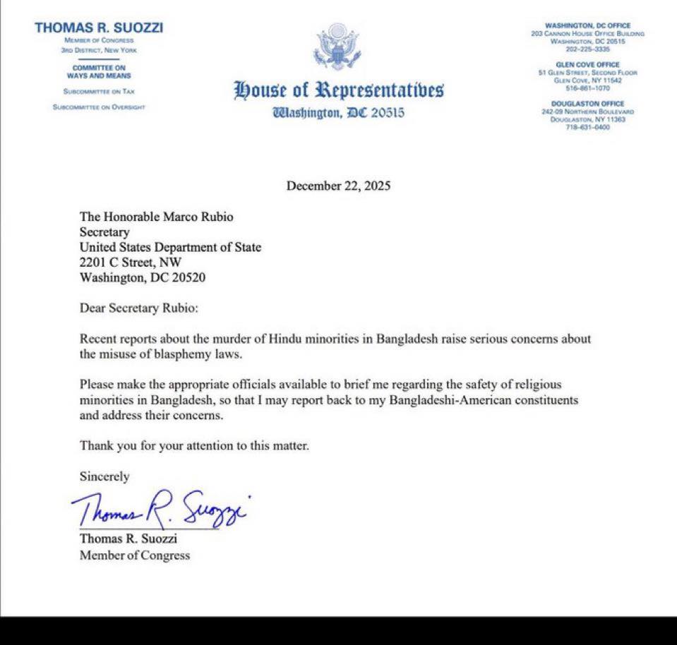 Congressman Ritchie Torres of New York, who co-chairs the Congressional Caucus on Bangladesh, joined Indiana Republicans Jim Banks and Victoria Spartz in calling the incident a serious failure of public security. They warned that minority communities, particularly Hindus, have faced increasing threats amid political instability that began earlier this year.