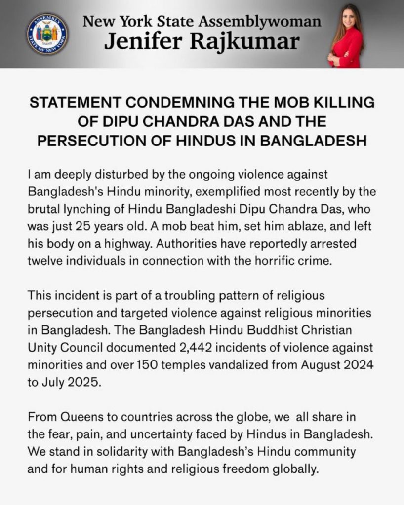 Separately, Congressman Ro Khanna of California also condemned the killing in a social media post, calling it unacceptable and urging the United States to press for justice and meaningful protections for Bangladesh’s minority populations.